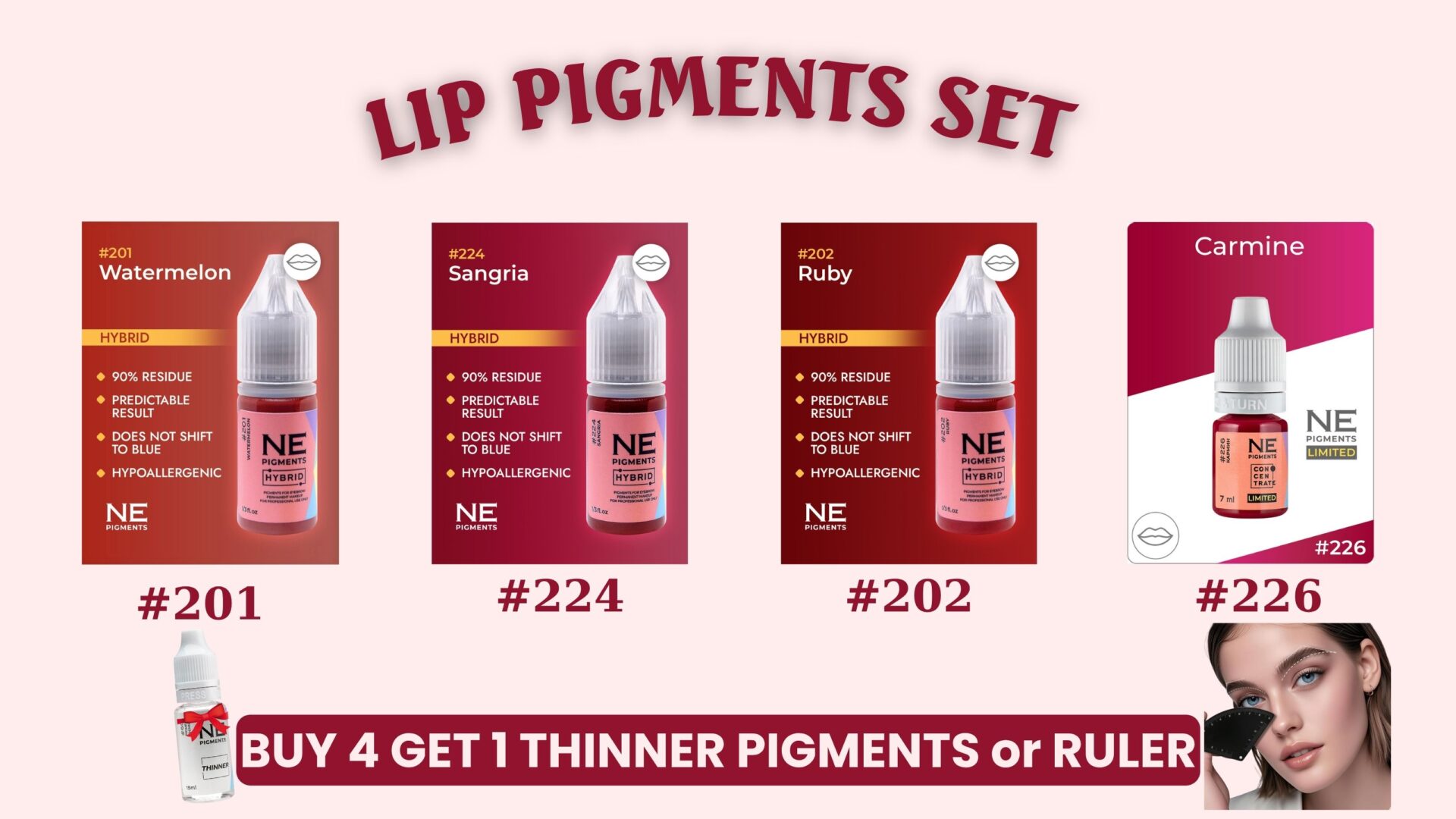 The NE Pigments Lip HYBRID Set features five stunning shades designed for professional PMU artists who seek natural, long-lasting lip color results.